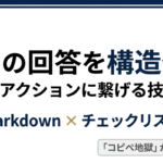 2026年1月1日 / 最終更新日 : 2026年2月6日 harakan 未分類 AIの回答を構造化し、即アクションに繋げる技術:Markdownとチェックリストで「コピペ地獄」から脱出せよ AIが出してくれた文章。内容は確かに素晴らしいし、間違っていない。 でも…「文字がびっしりで、読む気がしない…」「WordやPowerPointに貼り付けるときに、見出しや箇条書きを全部手作業で直さないといけない…」「『 […]