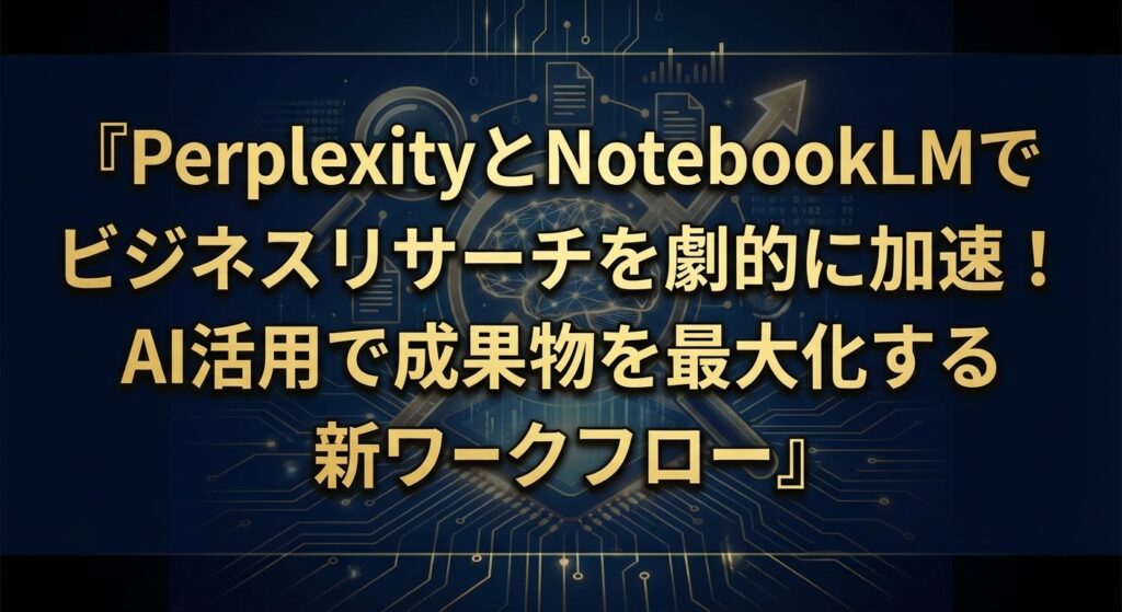本記事では、この課題を根本から解決し、ビジネスリサーチから最終成果物生成までのプロセスを劇的に加速させる、革新的なAIワークフローをご紹介します。それは、強力な情報収集・検証能力を持つ「Perplexity」と、収集した情報を整理・分析し、多様な成果物を生成する「NotebookLM」を組み合わせるというものです。この組み合わせが、いかに効率的で質の高いビジネスアウトプットを実現するのか、その全貌を詳細に解説してまいります。